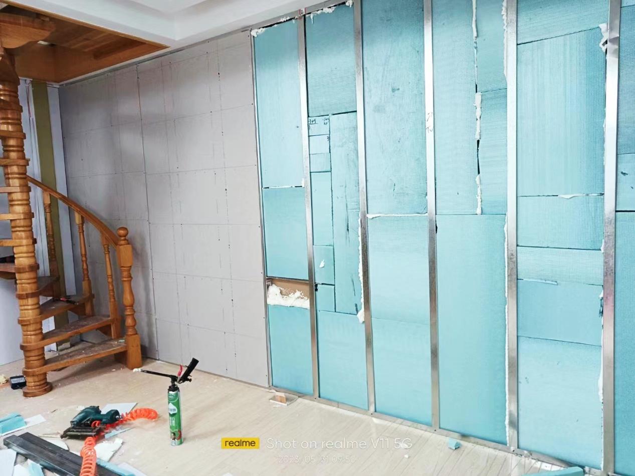 骨架采用龙牌轻钢龙骨、泰山石膏板、隔音材质使用板材+发泡填充,密封材料使用安泰牌密封胶。既保证了结构的轻巧。